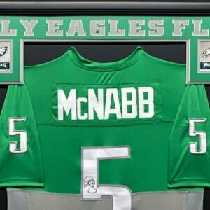 Custom frame measures approximately 34.5" x 42.5" in size and showcases a jersey which has been hand-signed by Donovan McNabb (Philadelphia Eagles). High quality framing includes the following unique features: Jersey is hand-sewn to the back mat board, framed with real wood molding, ultra strong and crystal clear UV-resistant acrylic, (2) licensed logo cards, (2) 8x10 photos, and a double-layer laser-engraved metal nameplate.