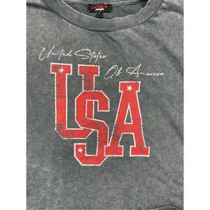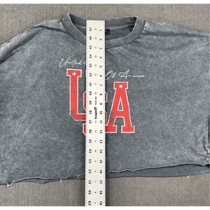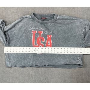 Washed gray cropped pullover from Don’t Call Me Jennyfer featuring bold red USA lettering and “United States of America” script across the chest. Designed with dropped shoulders, ribbed cuffs, and a raw edge hem for an effortlessly casual vibe. Lightweight fleece interior adds comfort without bulk. Please see photos for measurements.