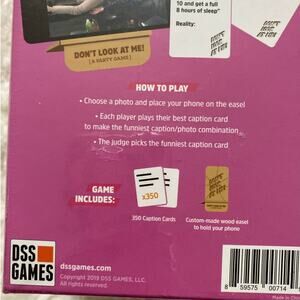 Know all those stupid photos you have on your phone? Time to put them to use. Choose a photo and place your phone on the custom wooden easel. Each player plays their best caption card to make the funniest caption/photo combination.