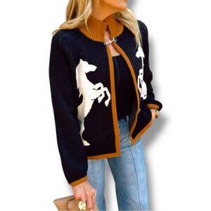 Embrace equestrian chic with this playful black cardigan-style sweater, detailed with rust brown trim and a charming horse bit along the neckline. The front showcases a striking white horse pattern, adding a spirited touch to your look. With cozy long sleeves, it’s perfect for trotting through cool days in style.