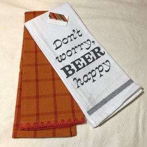 Don't Worry Beer Happy Set of Kitchen Bar Hand Towels NEW Holiday Party 2pc Pair