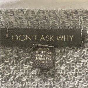 Don’t Ask Why gray long sleeve thin knit sweater. High low hemline. In one size. Great condition. Armpit to armpit is approximately 22 inches. I’m a size large and it fits nicely.