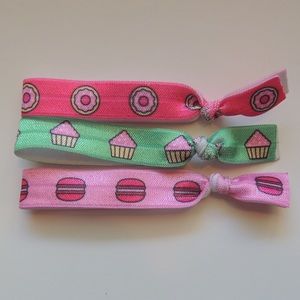 Donut, macaron and cupcake hair ties! Made in the USA, by The Hair Tie Girl! No trades, firm price. Includes 3 elastic hair ties. For a bulk order, let me know and I can make a separate listing! Cute on your wrist and gentle in your hair!