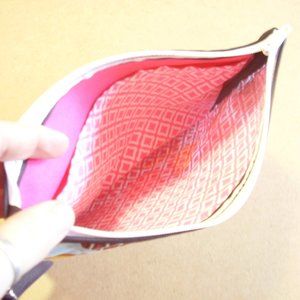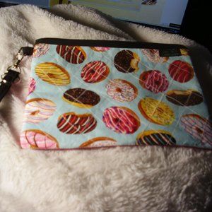 Donuts Wristlet with removable keychain (strap) 6.5"x 9" inches with cute pink and white geometric design lining and two interior pockets with a full zip closure. Made using high quality fabrics and materials and featuring a Ykk zipper and made by hand in USA by designer, Sarah Lynn Brown, Sarah's Designs in North Carolina.