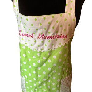 Green and white polka dot apron with "Sweet Memories" embroidery, designed by Doodlebug Design Inc. Made of 100% preshrunk cotton, one size fits most.