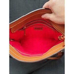 The Dooney and Bourke Pebble Leather Lexington Shopper Bag in Caramel is a stylish and versatile tote designed for travel, casual outings, and business meetings. Made from high-quality pebbled leather with gold-plated hardware accents, this medium-sized bag features a zip closure and double brown leather handles for easy carrying. The interior is lined with red cotton and includes bottom studs for added durability. With its rectangular shape and solid pattern, this designer bag exudes sophistication and practicality, making it a perfect choice for everyday use. The exterior is in great condition. The interior has a few minor stains. See photos.