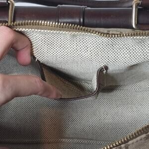 Flaws: Small scratches on the leather part and one area of discoloration on the fabric. All flaws are pictured above with a red arrow pointing to them.