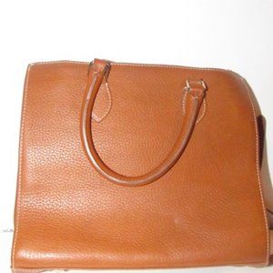 This is a fabulous, Dooney and Bourke two-way satchel style bag with a long, removable and adjustable, leather cross body strap. The purse is made of textured camel leather with gold hardware and a gold, cut-out and engraved, Dooney and Bourke plaque at the center of the bottom.