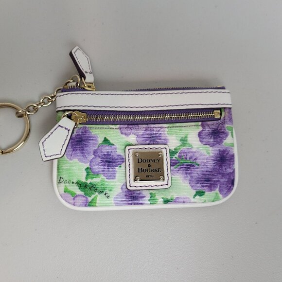 The Dooney & Bourke 1975 Coin Purse is a vintage accessory designed for everyday use by women. It features a floral look in a purple color, making it a lovely addition to any outfit. With the reputable Dooney & Bourke brand, this coin purse is a stylish and practical choice for keeping small items organized and easily accessible.