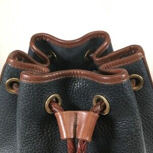 Dooney Bourke AWL Pebbled Leather Drawstring Hobo Bucket Navy Brown Shoulder Bag. Perfect everything bag from the 1980's. Excellent preowned condition. No rips, cuts, or holes. No wear on corners, piping is intact but has darkened a bit on the bottom corners. Has some marks on the suede lining on the bottom inside. Brass is nice and shiny with very few scratches. Leather is in great condition. Strap is also in great condition, no wear. Please see pictures. Guaranteed authentic. All-weather leather. Drawstring closure. Interior: One large compartment with D-ring to clip keys. Brass hardware. Dooney & Bourke duck logo on the front. Brass Dooney & Bourke duck hangtag bag charm. Adjustable shoulder strap with a 16 drop. Size: Approximately 10" x 12" x 6". Check out our huge selection of thrifted treasures - bundle your purchases and save on combined shipping!