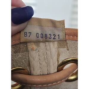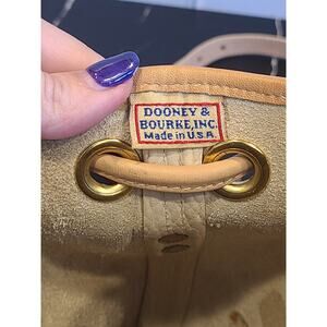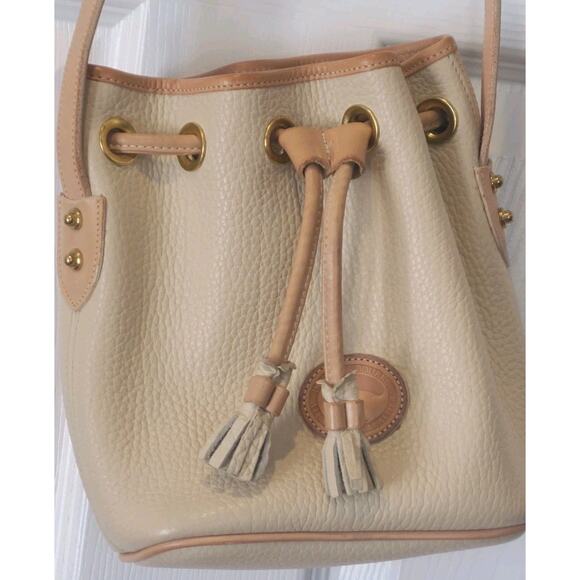 Vintage 1980s/ 1990s Dooney & Bourke Adjustable Mini Crossbody Bucket Bag Cream Pebbled Leather with Tan leather Trim | Solid Brass Hardware | Leather Interior | Tassel pull Closure | Excellent USED Vintage Condition | *Flaw, there are a couple of water stains on the leather strap and signs of wear from previous use. Inside Interior has a couple of marks | Please refer to the photos for the condition | Brass Duck fob included | Genuine Leather Body and Trim. Made in the USA.