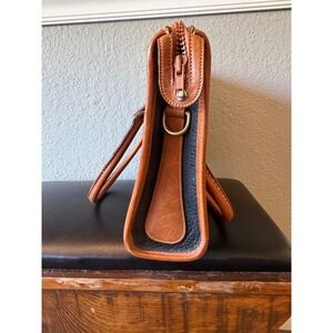Presenting a vintage Dooney & Bourke satchel, a testament to enduring style and quality craftsmanship. This handbag offers a timeless design with its distinct black and brown color block, accented by the iconic duck logo emblem. The perfect blend of sophistication and practicality, this satchel features a spacious interior with a zippered compartment for valuables, ensuring your essentials are always secure and organized.