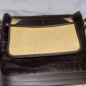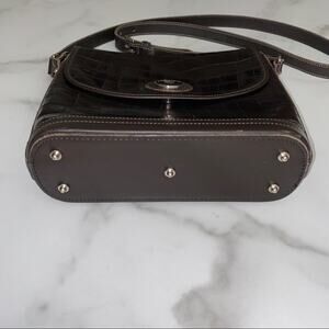 Crocodile embossed calfskin leather. Produced late 1990's to early 2000's. Made in the USA. Crossbody style with adjustable strap. Silver tone solid brass hardware. Red, white and blue cloth tag with serial number on the back. Magnetic snap closure. Five metal feet.