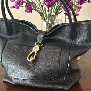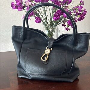 Luxurious leather and understated design are a winning combination in this soft, slouchy tote. large outside pocket, gold plated lock closure and extra long handles.