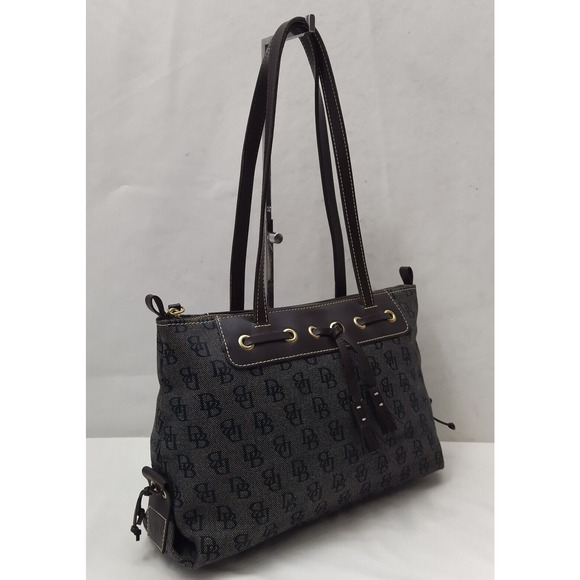 Dooney & Bourke Black Canvas Leather Trim DB Printed Tassel Tote Shoulder Bag