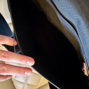 Sleek black design with leather accents. Perfect for everyday use. Stylish and functional. Measures 13 inches long, 12 inches tall, 4 inches wide. 47 inch adjustable strap.