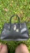 Black Douney and Bourke business casual bag. Wear with a medium length strap or off the shoulder. Has mild wear and tear on front of bag, you could probably buff it off with a leather cleaner. Wear and tear on hardware which is pictured and staining inside bag.