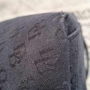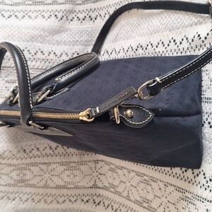 Elegant Dooney & Bourke handbag. Features a sleek black design. Black signature fabric and black leather trim. Gold hardware. Perfect for any occasion. Mini Julliette Satchel measures 12" by 9" and 6" deep. This bag is in very good preowned condition. As common in this style of bag there is corner wear because of the nature of the very sharp corners. Please refer to pictures. Inside has some discoloration due to use.