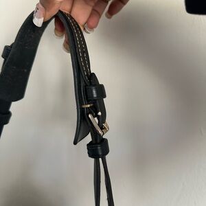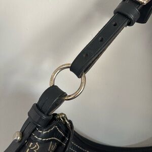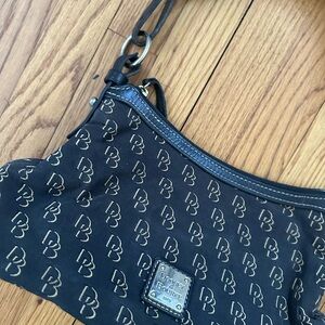 This Dooney & Bourke shoulder bag features a sleek black design with a subtle monogram pattern, offering a blend of elegance and practicality. The crescent shape and single strap make it perfect for carrying over the shoulder, while the metal hardware adds a touch of sophistication. Ideal for any occasion, this bag is a stylish addition to any wardrobe.