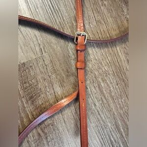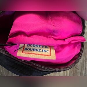 Elevate your style with this elegant Dooney & Bourke crossbody bag. Crafted with durable nylon material and accented with a brown leather strap, this bag is perfect for both travel and casual occasions. The bag features a rectangular shape with three zippered compartments, providing ample space to store your essentials. There are some pen marks in the top outside pocket.