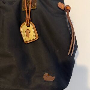 Classic Dooney & Bourke tote crafted in durable black nylon with genuine leather details and contrast stitching. Features brown leather handles, stitched leather accents, and Dooney & Bourke logo detail on the front.