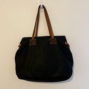• Material: Black nylon with brown leather trim and handles