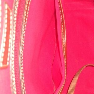 it isn't pre-owned condition it does have some signs of wear it has some scuffs on the brown on the bottom and it does have some marks in the red interior they're not really bright so they were kind of hard to capture on camera but there is some staining on the inside of the bag it's very light it does not have a cross strap with it so it's just the handle to hold when carrying it bottom of the bag does have some wearing from being used some white stuffing on the brown I tried to show that in pictures and there's one mark on the black of the bag has always I love offers and have a wonderful day. g10
