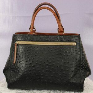 Elegant Dooney & Bourke structured satchel in black ostrich-embossed leather with tan trim and gold-tone hardware. Features double handles, detachable crossbody strap, and a striking red interior. A timeless, high-end handbag that blends style and sophistication.