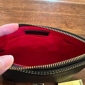 NWT Dooney & Bourke black leather cosmetic bag or pouch. Zipper close. Interior is red cotton fabric. Never been used.