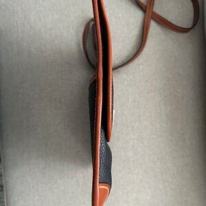 Elegant and effortlessly classic, this Dooney & Bourke crossbody features rich black pebbled leather with smooth saddle-tan trim and gleaming gold hardware. The sleek, ultra-slim silhouette makes it perfect for travel or everyday wear.