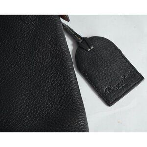 Large bag, unsure of style name. Has some pen stains inside, minor marks on exterior, including on the underside of the strap. Also one of the side flaps is missing a piece of hardware to hold it in place. Bag measures 17" wide at the widest point, 13" tall at tallest point, and 5" deep. Will fit most normal sized laptops.