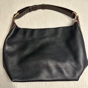 Sleek black leather hobo with rich brown strap. Gold hardware accents. Timeless style. In great condition. Some minor scratching on leather sides and handle.
