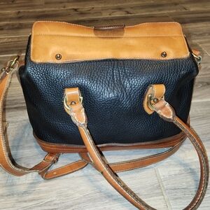 Elegant black leather satchel with brown leather accents. Features sturdy handles and brass hardware. Classic Dooney & Bourke style.