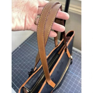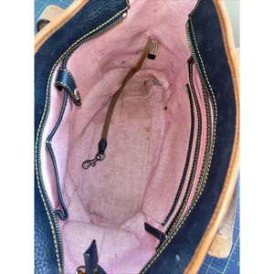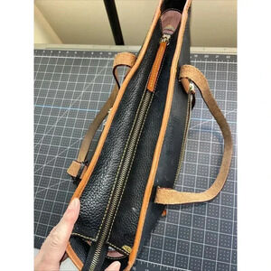 Stylish black crossbody bag with tan accents. Features a classic design. Perfect for everyday use. Vintage.