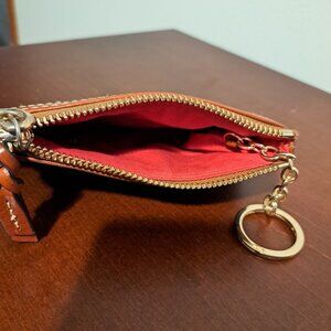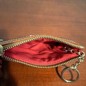 Dooney & Bourke Black and Tan Wristlet With Strap. Condition: Scuffing along the edging. Features: strap, key ring, zipper closure, red interior.