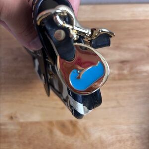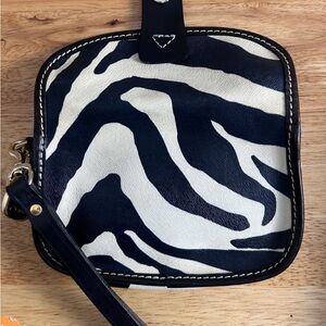 Stylish zebra print clutch. Features secure snap closure. Includes wristlet strap for easy carrying.
