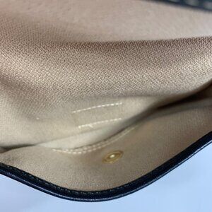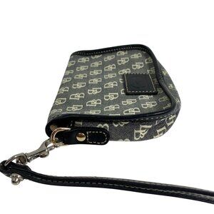 This stylish Dooney & Bourke wristlet features a black and ivory design with leather trim and a duck logo. The pouch is in excellent used condition, perfect for keeping your essentials organized.