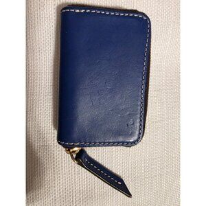 Authentic Dooney & Bourke small zip-around leather card case in a rich blue color with contrast stitching and gold-tone logo plate. Compact and stylish — ideal for carrying credit cards, folded bills, or IDs without the bulk of a full-size wallet.