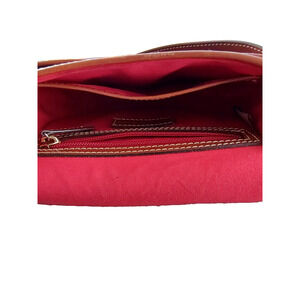The Dooney & Bourke Blue Pebble Grain Hallie Bag is a stylish crossbody bag with a unique crescent shape and a pebbled exterior finish. It features a magnetic closure, brown leather handle/strap color, and gold hardware accents. This medium-sized bag is perfect for travel, casual outings, and business meetings, offering both style and functionality. With inner and outer pockets, an adjustable strap, and lightweight design, this bag is both practical and fashionable. The blue exterior color, red lining, and gold-plated hardware make it a classic and designer accessory for any outfit.