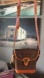 Elegant chocolate brown leather bag with orange trim. Features a classic flap closure and adjustable shoulder strap.