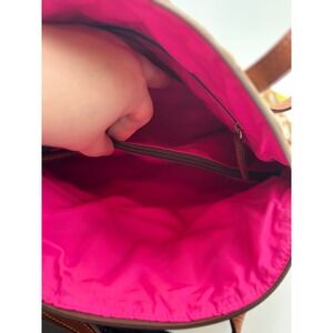 Keywords: Dooney & Bourke, Satchel, Handbag, Novelty Print, Duck, Star, Heart, Patchwork, Brown, White, Canvas, Leather Trim, Pink Lining, Casual Bag, Designer Bag