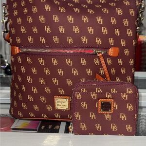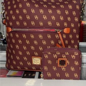 Elegant Dooney & Bourke bag with matching wallet. Features a burgundy and tan logo design with orange accents.