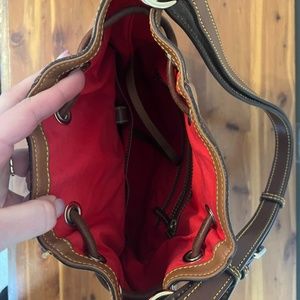 Like new. Camel leather top handle bag from Dooney & Bourke. Lock feature and topstitching.