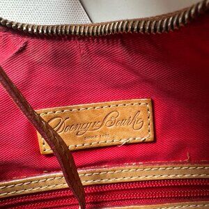 - Red twill fabric lining with a leather Dooney & Bourke patch and an interior zip pocket