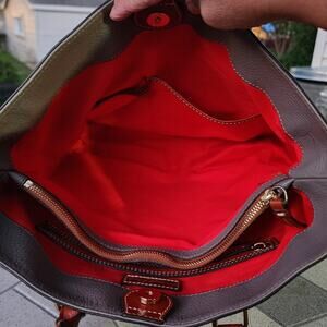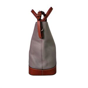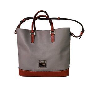 NWOT: Gorgeous, contrast grey/cognac brown "Chelsea" pebble grain leather shopper/tote bag with distinguished D&B details / double roll handles / adjustable shoulder strap / magnetic snap closure / gold tone hardware / large size / contrast stitching / spacious interior / divided compartment / signature red fabric lining / multiple zip & slot pockets / wide base / bottom feet / logo emblem by Dooney & Bourke. In excellent like new condition with working zippers & intact seams. Approx. Dims: 14"L × 12"H × 7"D Approx. Handle Drop: 5" Approx. Shoulder Strap Drop: 11"
