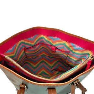 Designed to be worn easily over shoulder w/ roomy interior that interior a vibrant multicolor lining. Large compartments & inside pockets allows for organization, accessibility & ample room. Allowing you ease & functionality for a range of uses & occasions.