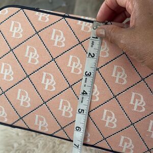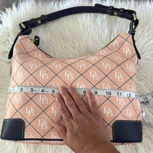 This Dooney & Bourke hobo bag showcases a sophisticated blend of pink and black, offering a timeless style that complements any outfit. Its structured silhouette and clean lines make it a practical choice for everyday use, while the brand's signature craftsmanship ensures durability and elegance.color peach and navy blue excellent condition smoke free home