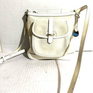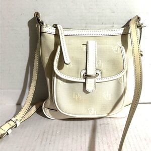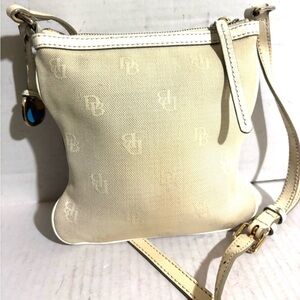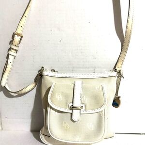 Elevate your style with this Dooney & Bourke cream canvas crossbody bag. With leather straps & trim Perfect for any occasion, this bag combines elegance and functionality. Main compartment 2 pockets at interiors wall 1 zip closure lining have some stains pocket at front hangtag at side exterior have some stains marks hight 9” wide 9” depth 25” adjustable The dimensions are based on approximately measurements before placing an order please check take a moment to view all photos using feature for a closer look The dimensions are based on approximately measurements before placing an order please check take a moment to view all photos using feature for a closer look