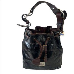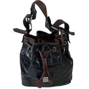 Absolutely gorgeous Dooney & Bourke drawstring bucket bag from Dooney's now retired Bayou exotic leather collection circa early 2000's. Gorgeous, deep brown, Croc embossed rich textured leather with burnt cedar leather trim. Serial# J1261683-tag is snipped, indicating an outlet bag. This bag looks and feels so luxe and the leather smells amazing! Very good preowned condition with a couple spots of dye transfer on the lining from the leather & some loss of the wax seal on the drawstring ends & harness strap. Please see photos for more details. Happy to answer any questions.