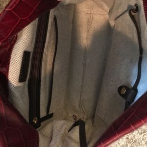 Dooney & Bourke Medium Size Red and Bourban Brown Crocodile Embossed Leather Logo Lock Hobo Bag.